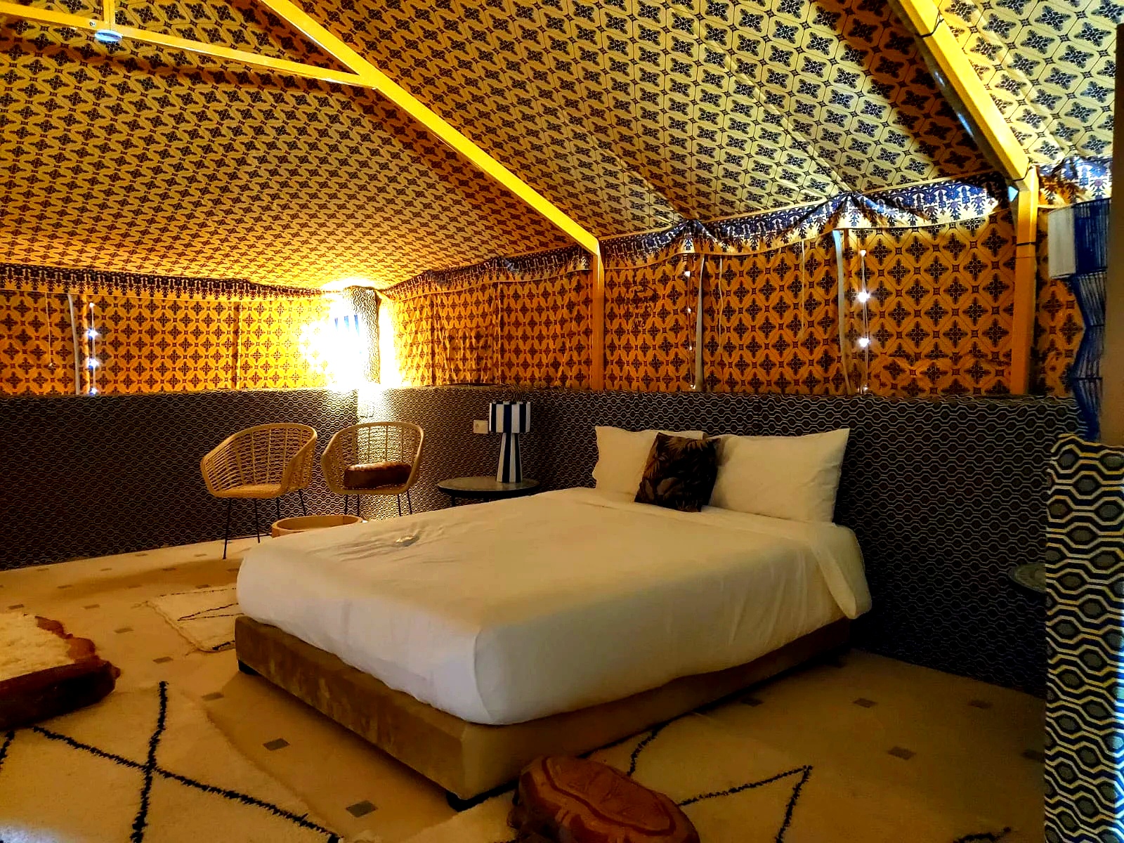 Notre Tente Quadruple est le choix idéal pour un séjour confortable dans le désert d’Agafay, près de Marrakech. Spacieuse, chaleureuse et parfaitement aménagée, elle convient parfaitement aux familles, aux groupes d’amis ou aux voyageurs qui souhaitent vivre une expérience authentique dans le désert tout en bénéficiant d’un excellent niveau de confort.